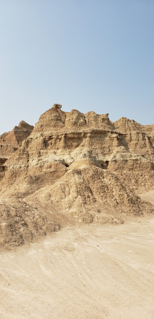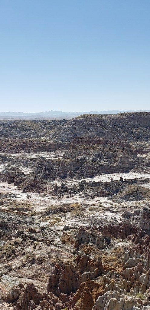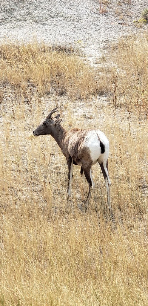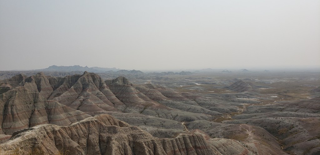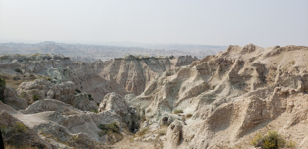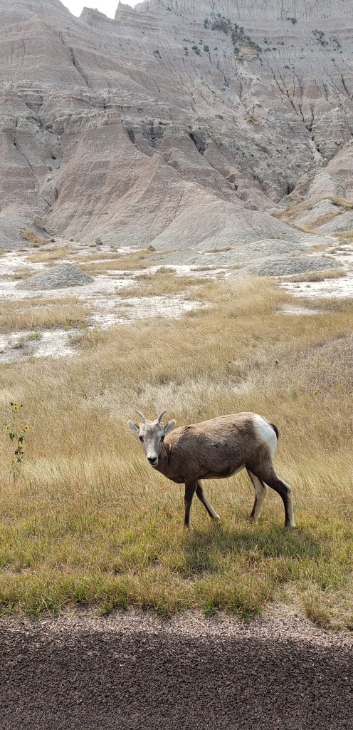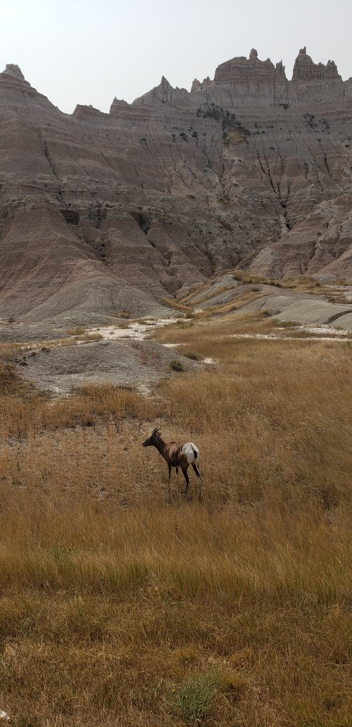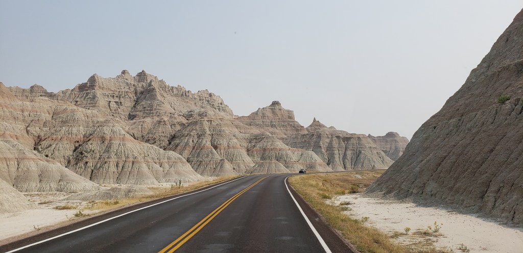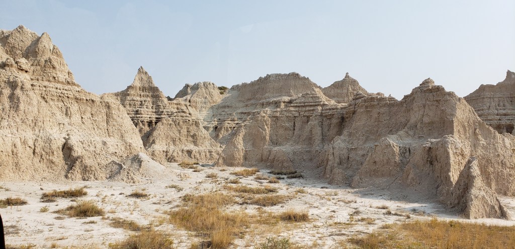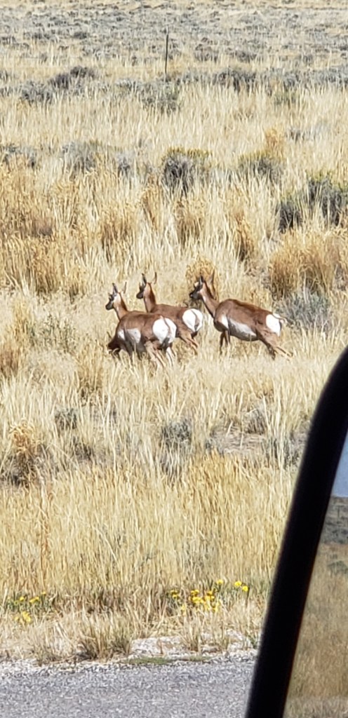 Last glance at the Tetons as we head east.Tetons in the rearview. The beginning of the hundreds or maybe thousands of Pronghorn Antelope we saw!ππThese metal art pieces were all along the highway. After several hours, we came across a “scenic overlook” and pulled over to investigate. The next several pictures are without the windshield glare.“Hell’s Half Acre”Gorgeous rock formations πHoodoos Some hunter bagged a nice elk.Over a mile of old engines π²Devils Tower – first glance