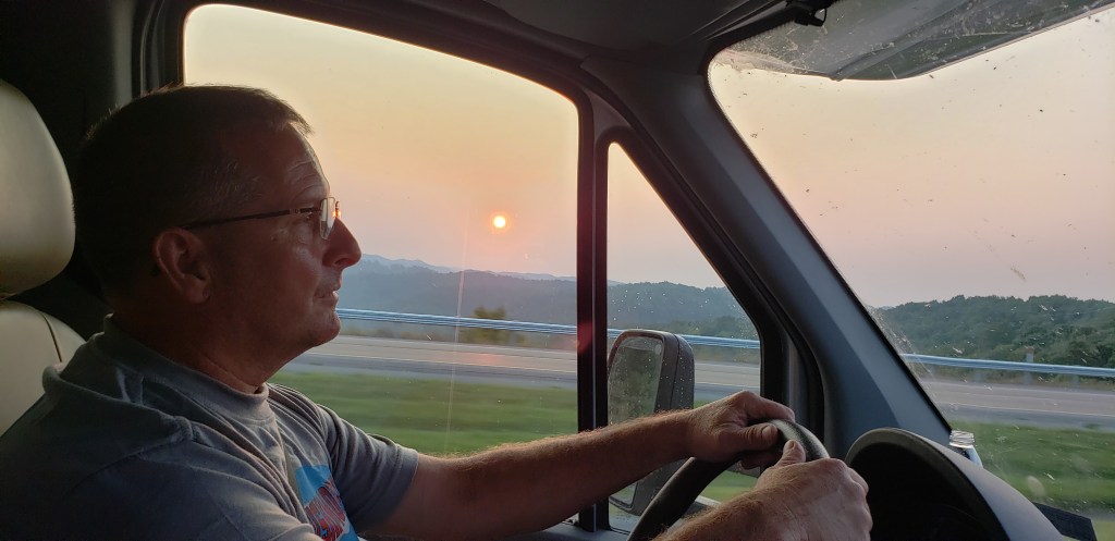ππSunset over the West Virginia mountains ππOur last campsite of the trip…an old auto sales lot turned RV parking for 12, full hookup only $30 ππ Perfect! Its even creekside! No restaurant beats Derekβs grillin’ ππ